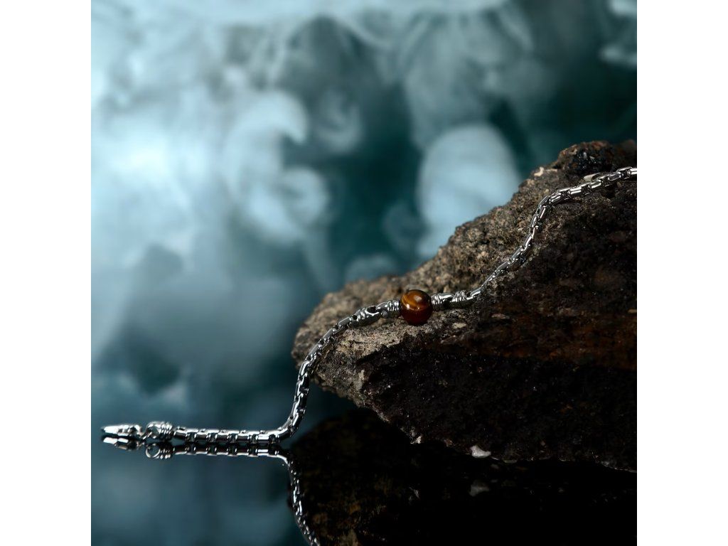 Design se vyznačuje 8mm kuličkami z pravého tygřího oka. Tyto kameny, známé svými jedinečnými hnědými a lesklými pruhy, jsou ceněny pro svůj intenzivní vzhled a teplé odstíny.