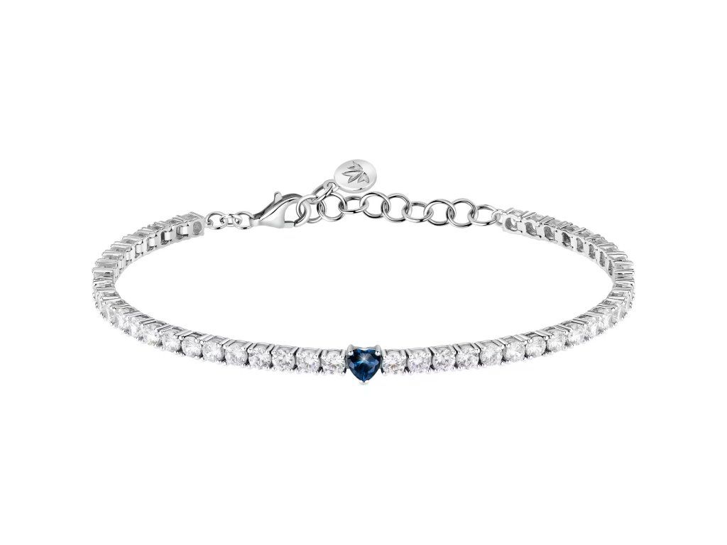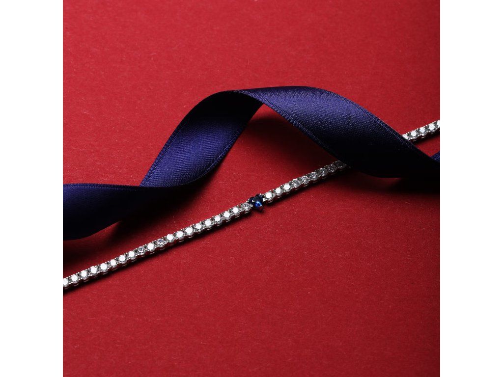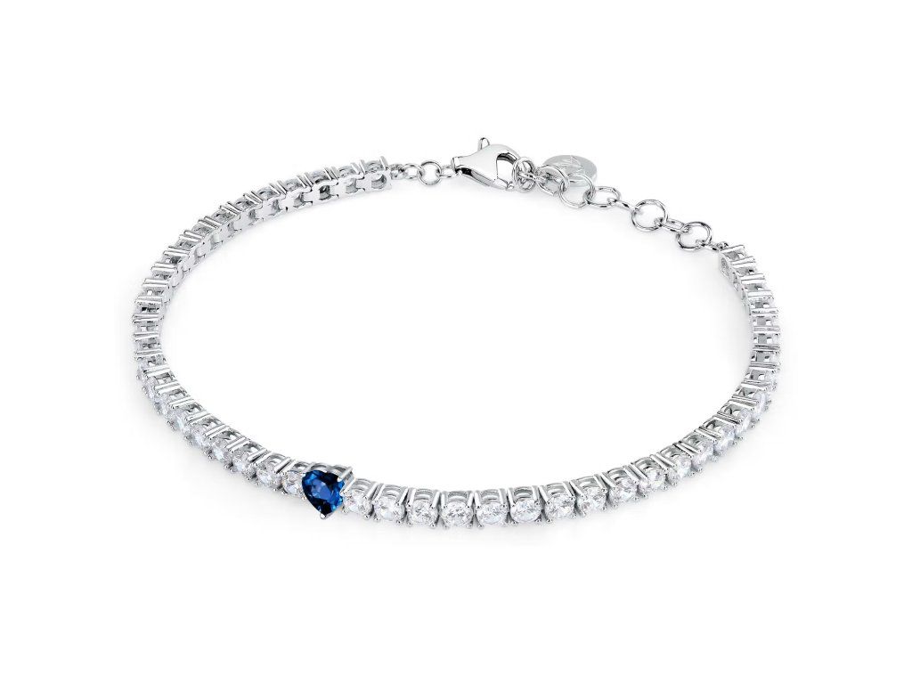 Je vyroben z kvalitního stříbra 925‰ a má provedení typu tennis, které perfektně padne na zápěstí. Třpytivé zirkony v bílé a modré barvě jsou pečlivě zasazeny a září intenzivním světlem, čímž vytvářejí působivý vizuální efekt.