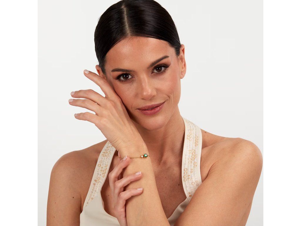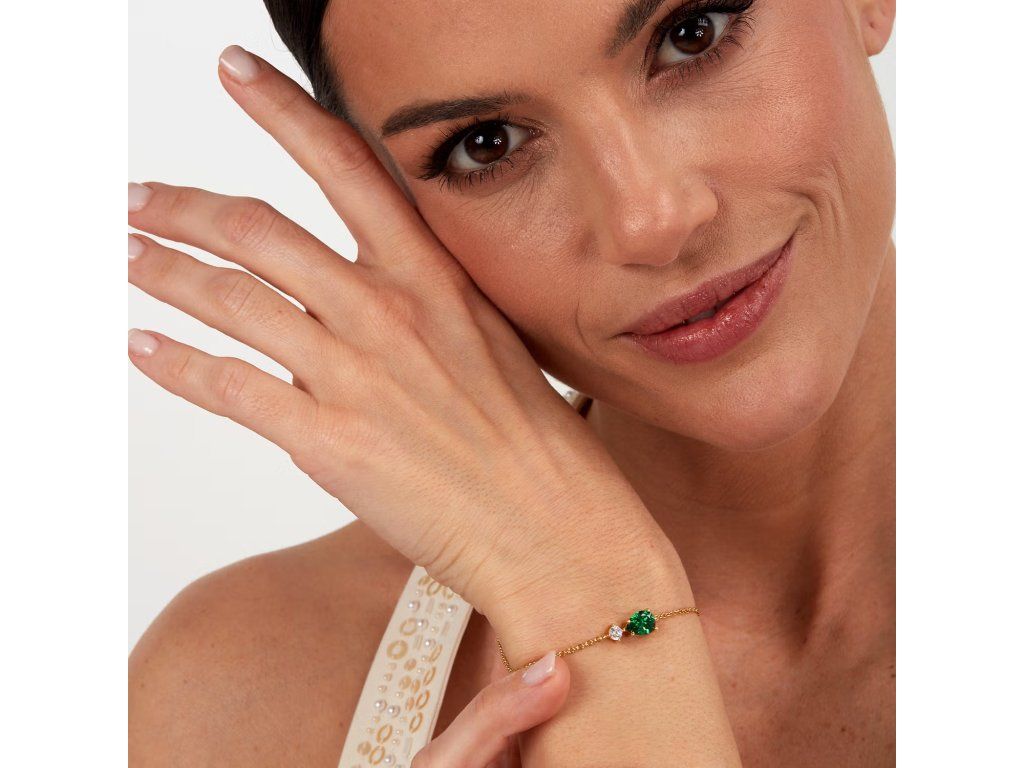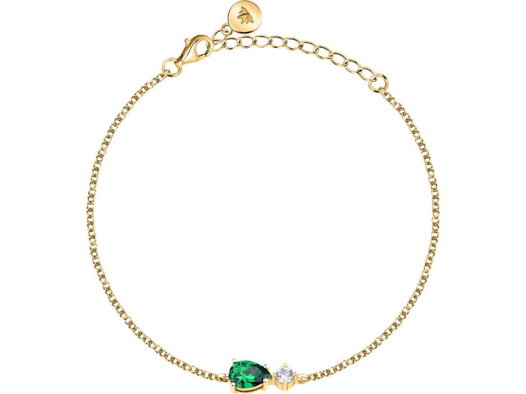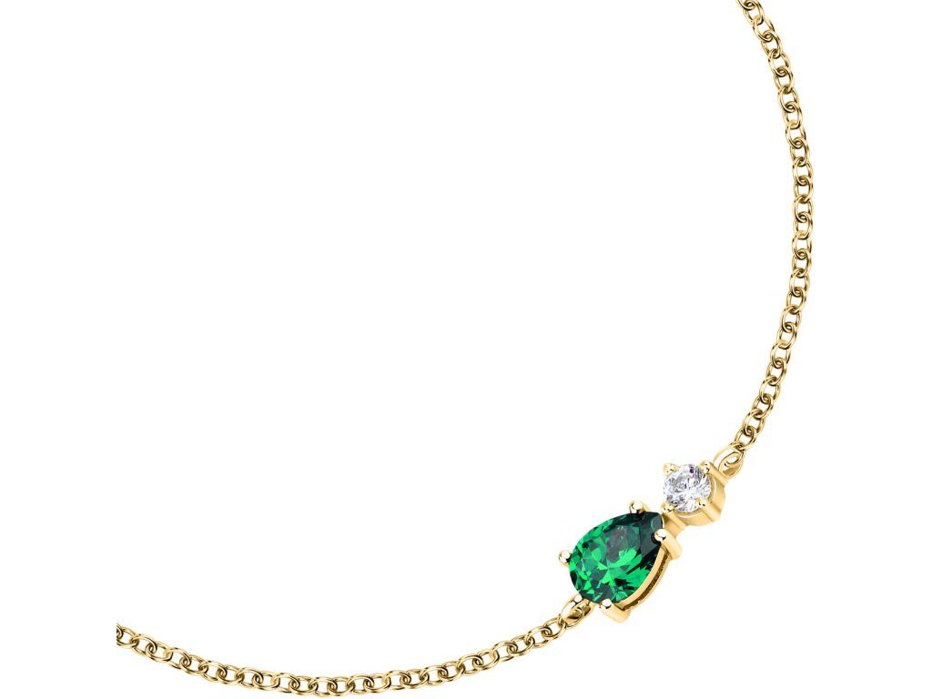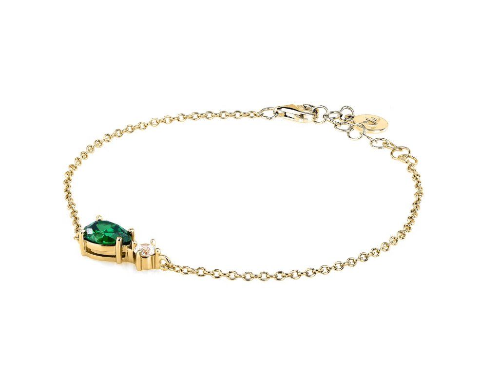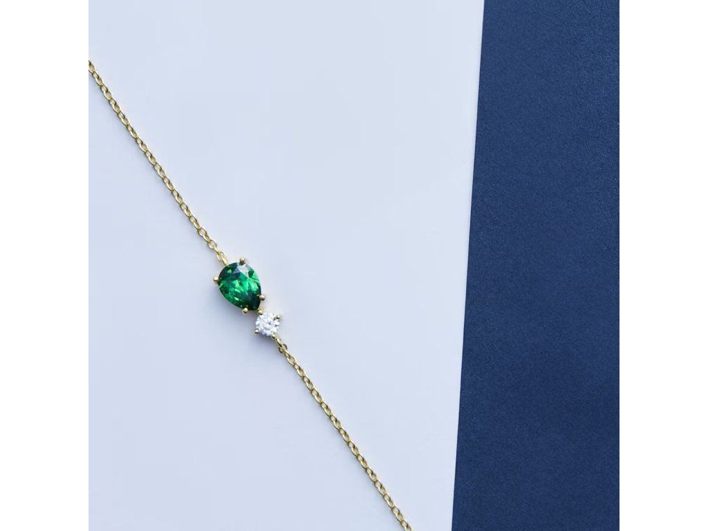 Je vyroben z udržitelného stříbra a zdoben zářivými zelenými zirkony pečlivě broušenými do tvaru kapky. Jeho zlatá povrchová úprava dodává šperku nádech luxusu a modernosti.