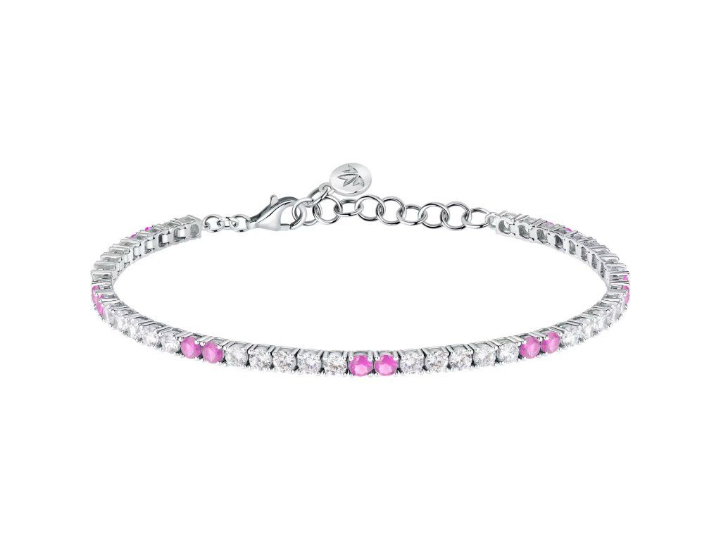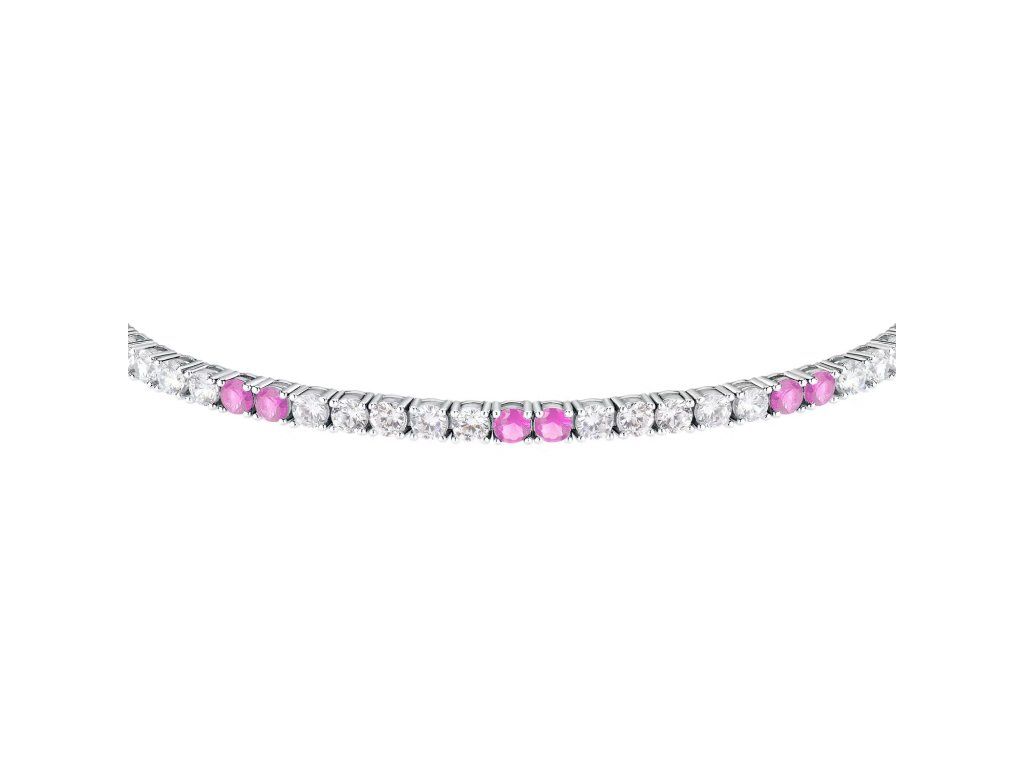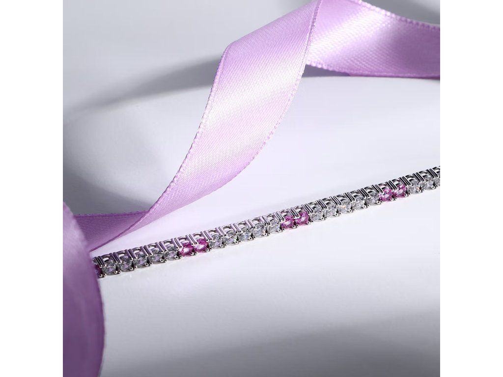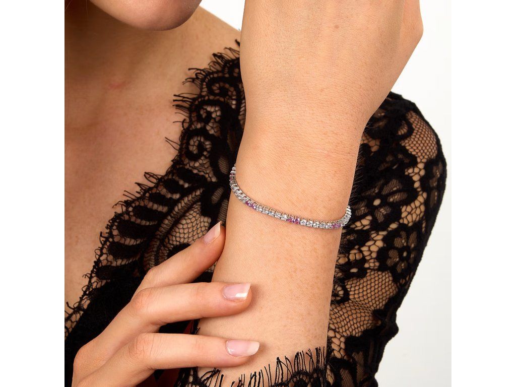 Nadčasový design tennis je obohacen jemnou řadou zirkonů v bílé a růžové barvě, které zachycují světlo a vytvářejí jemné barevné odlesky.