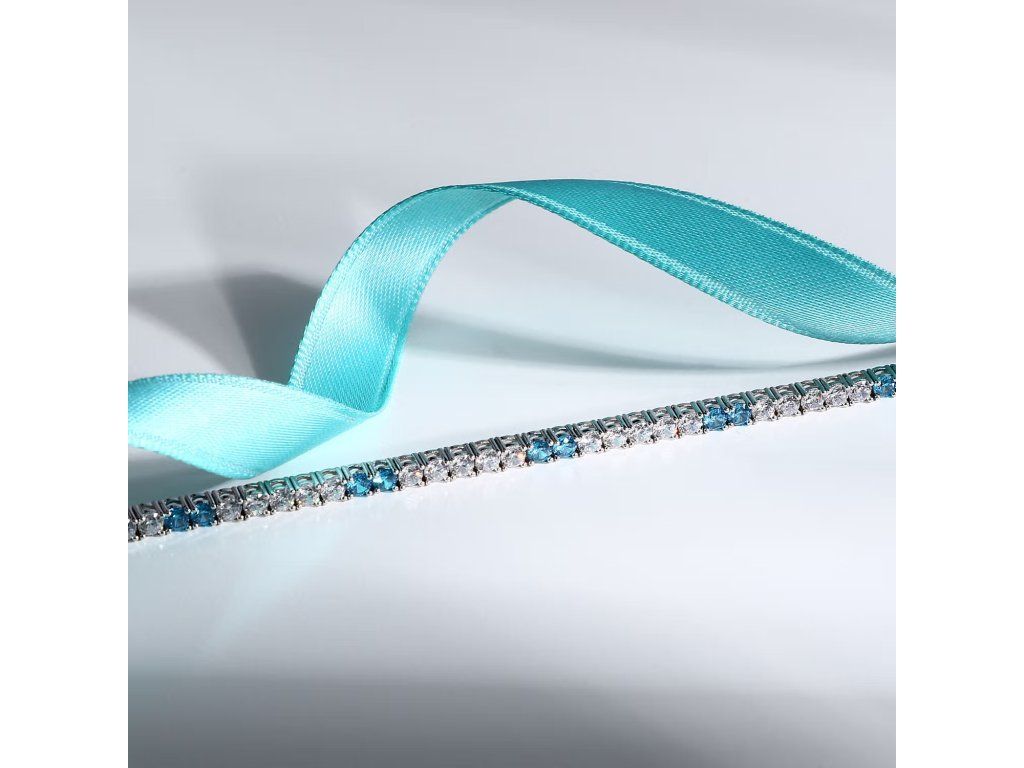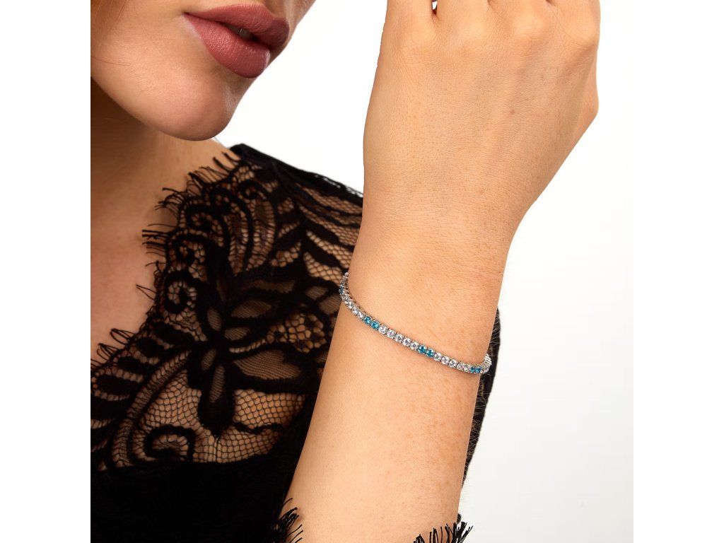 Jeho moderní a výrazný design je podtržen použitím udržitelného stříbra, které spojuje etický přístup s estetikou. Stříbrný odstín se harmonicky doplňuje se zářivými modrými a bílými zirkony. Ty jsou precizně zasazeny do struktury náramku a dodávají mu luxusní a současný charakter.