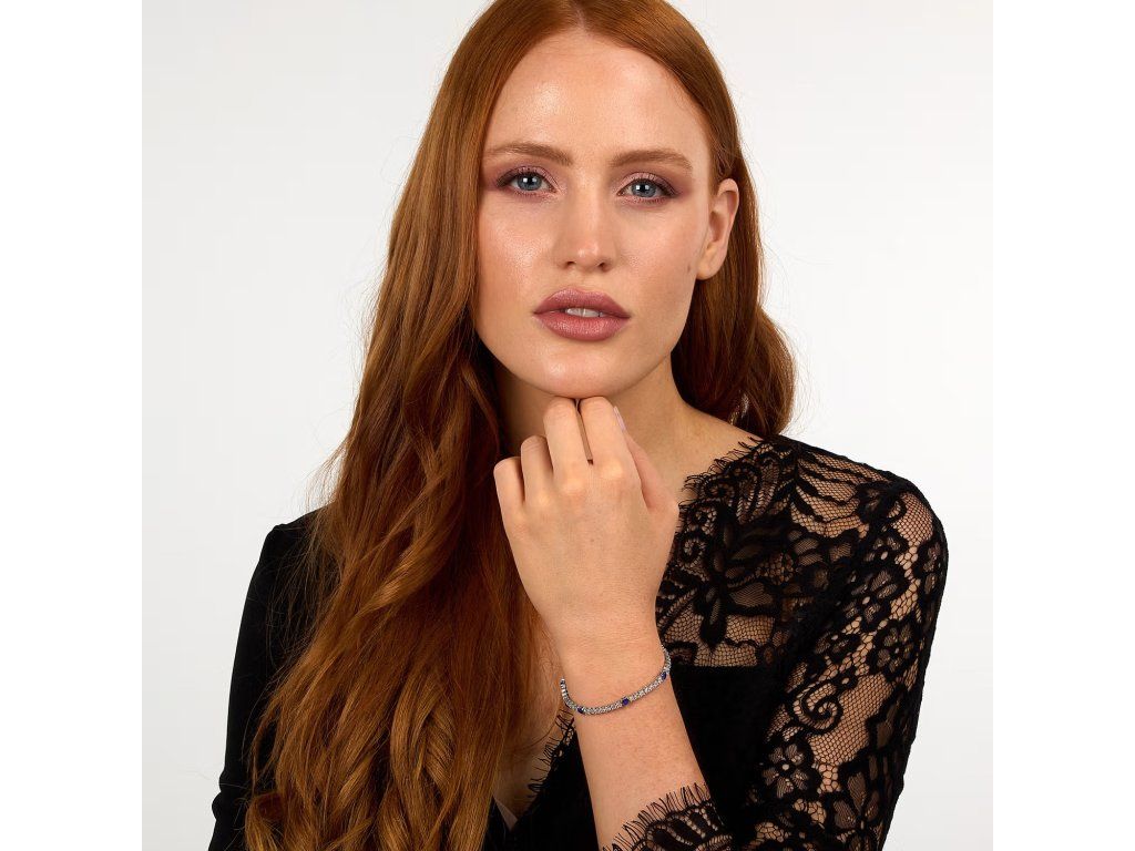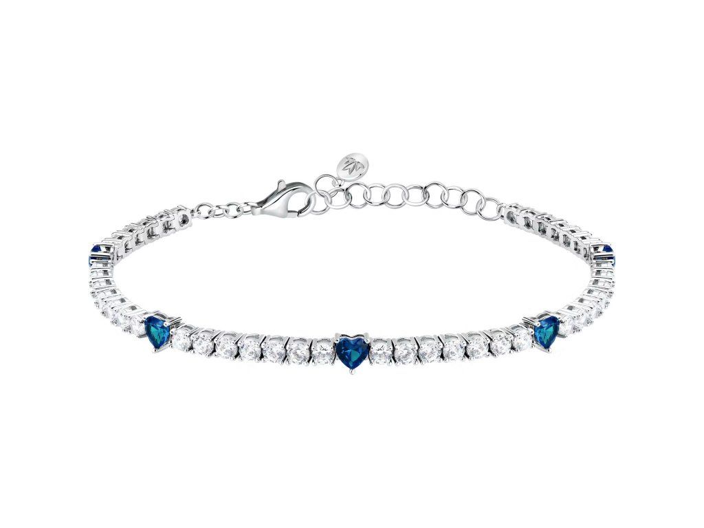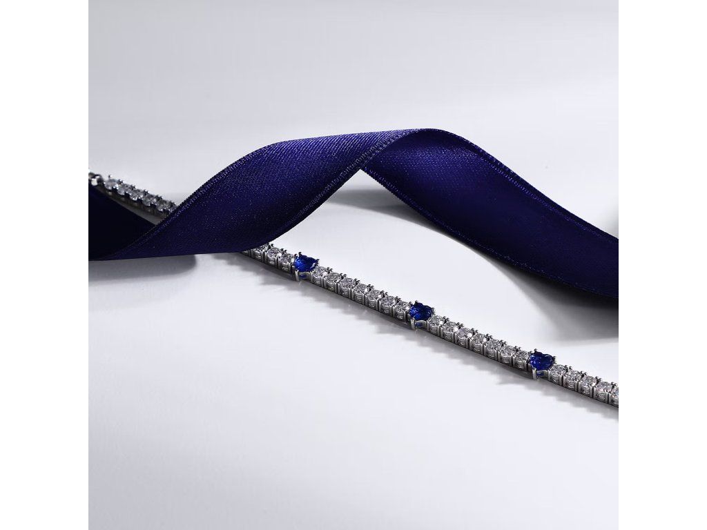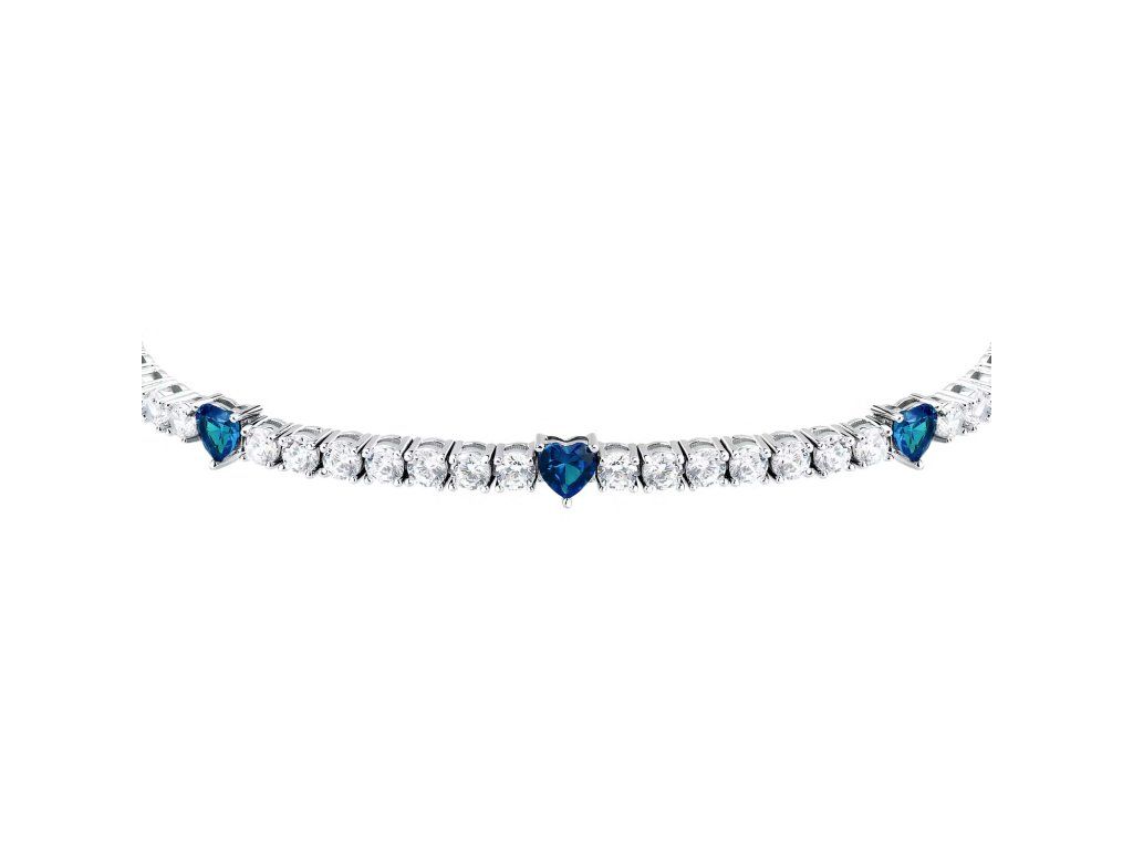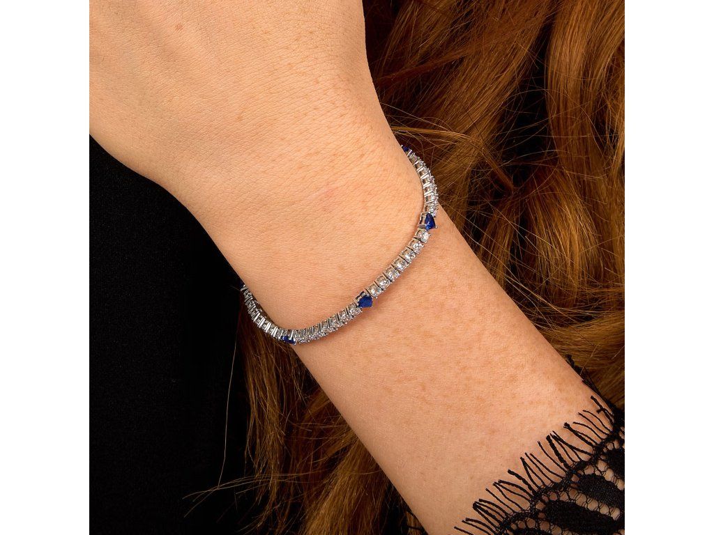 Je vyroben z kvalitního udržitelného stříbra a má klasický tennis design, který je zdoben třpytivými zirkony. Jemné střídání modrých a bílých zirkonů vytváří atraktivní vizuální efekt, zatímco decentní motiv srdce přidává romantický a smysluplný detail.