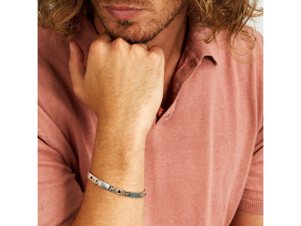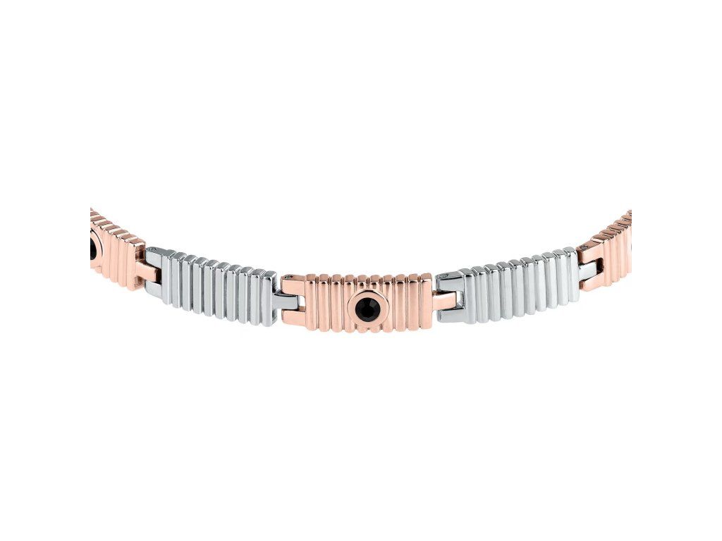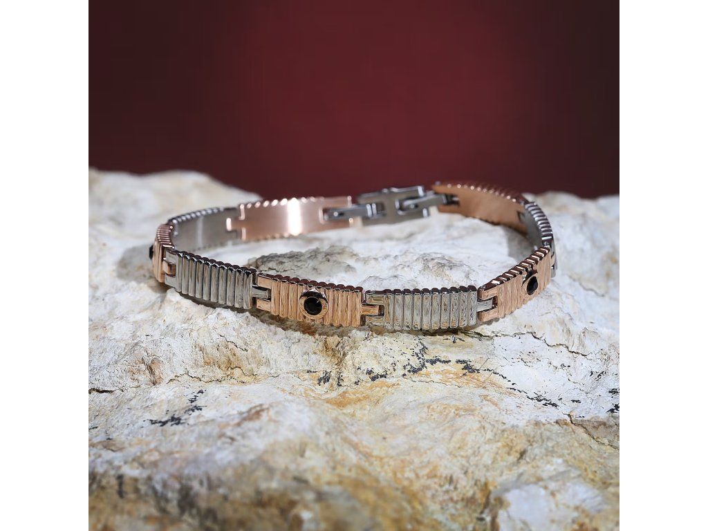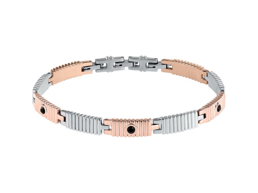 Vyrobený z odolné oceli, náramek má povrchové úpravy ve stříbrné a růžově zlaté barvě, což mu dodává jedinečnou univerzálnost pro každý pánský outfit. Detaily z černých krystalů o průměru 3 mm přidávají nádech jasu a elegance, díky čemuž se tento doplněk stává skutečným středem pozornosti na zápěstí.